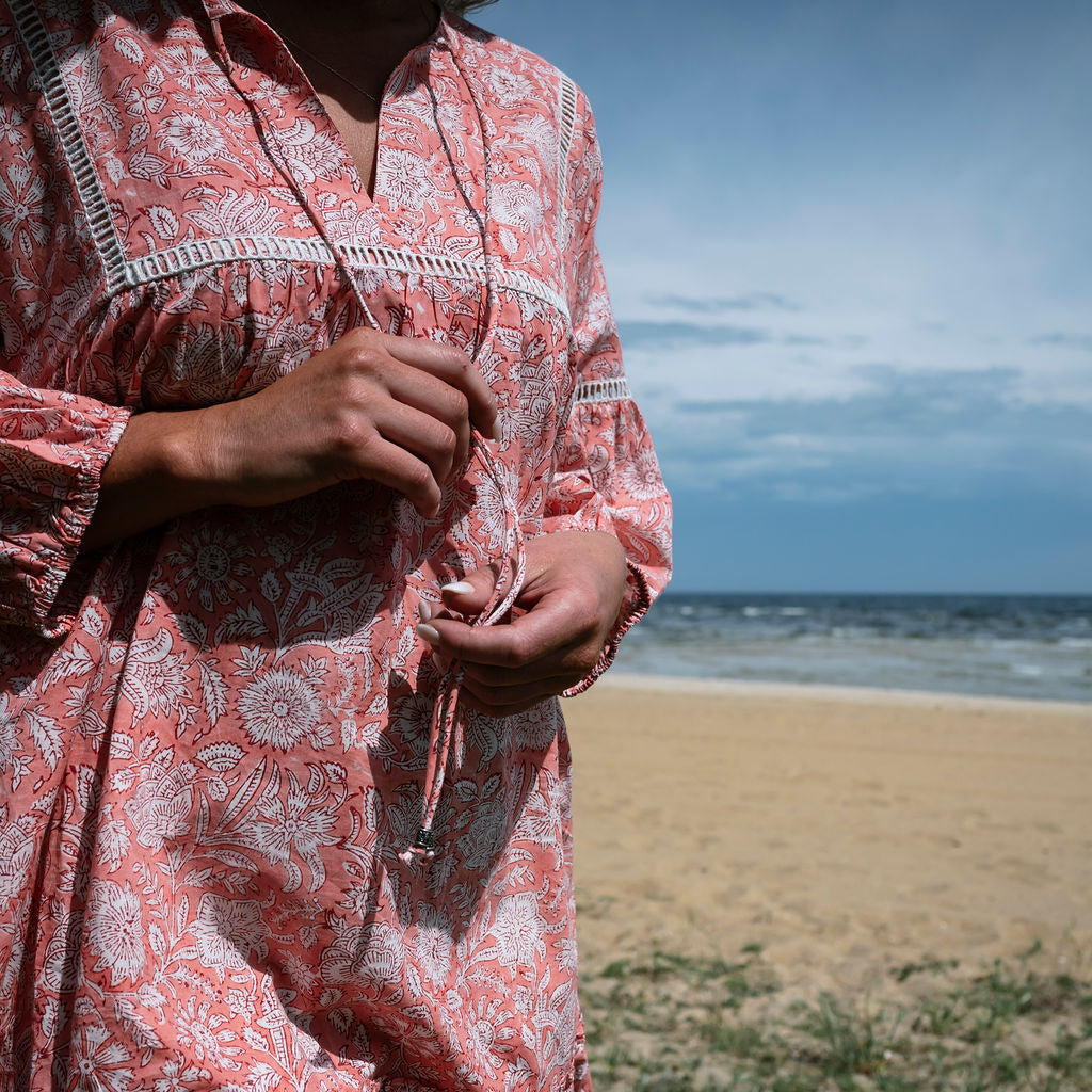This stunning garment is made of lightweight 100% cotton and features beautiful Indian wood-block print designs in a mix of vibrant tones. This midi-length dress is made to be loose fitting and floaty, with two front ties decorated with small silver toggles.